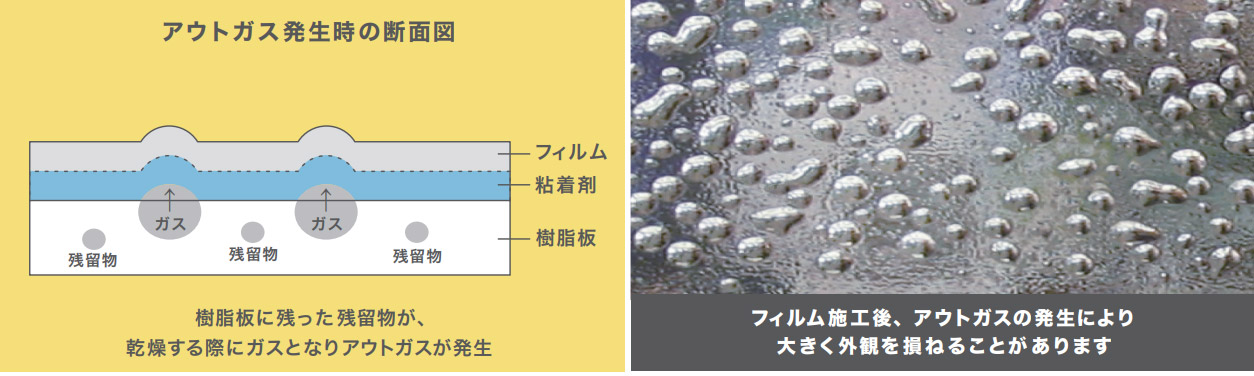 「アウトガス」とは、製造過程で樹脂板の中に残った水分や二酸化炭素などの残留物が、製造後も一定期間、樹脂外に放出される現象です。アウトガスを発生している樹脂板にフィルム施工を行うと、気泡等が発生する原因となります。特にメタリックフィルム、PETフィルムなど気密性の高い素材の貼り付けには注意が必要です。